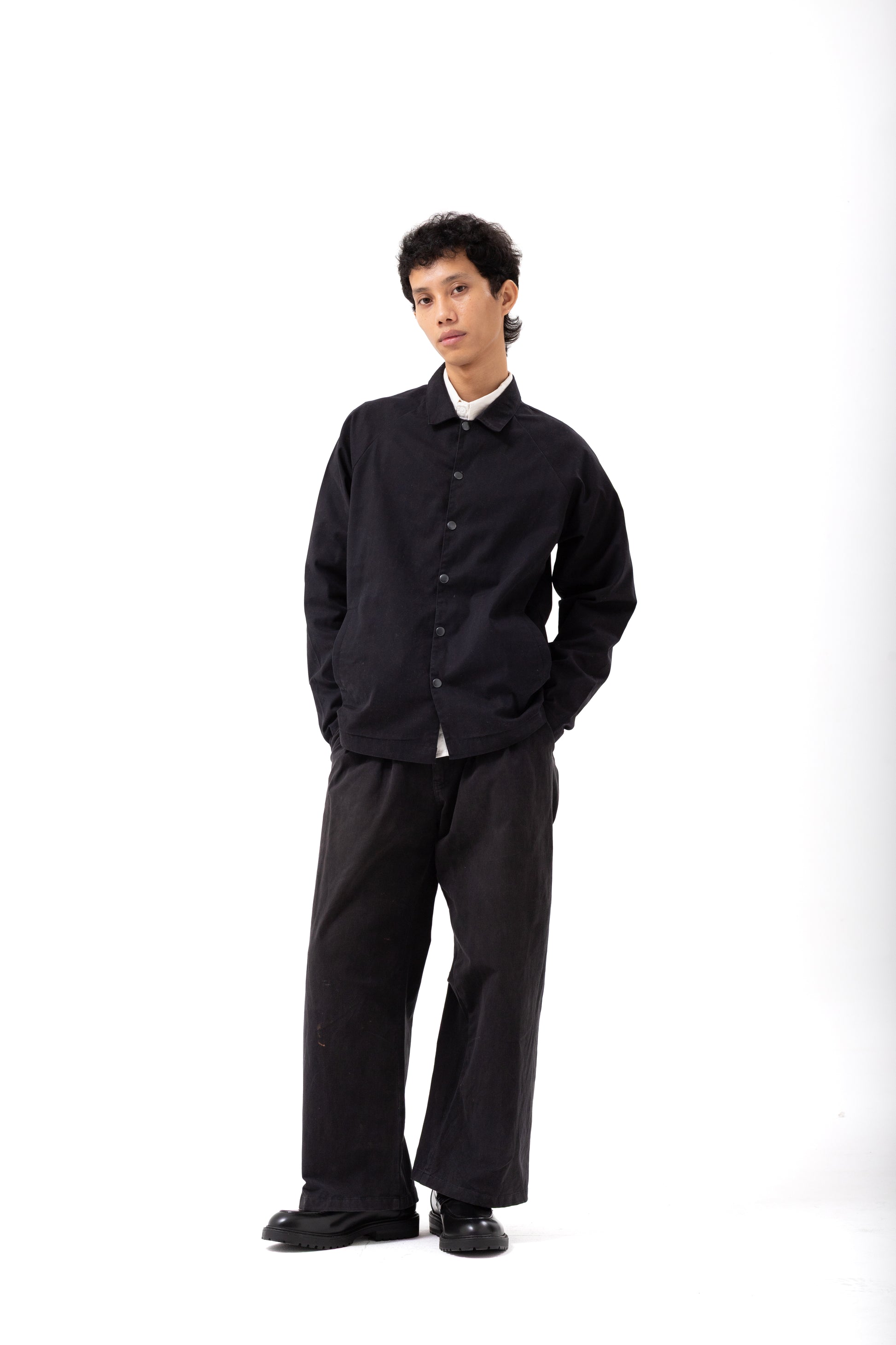 This expertly crafted Black General Jacket features practical raglan sleeves for enhanced mobility and a relaxed fit that ensures comfort throughout the day. Convenient snap button closure allows for quick on-and-off wear, while two side slit pockets provide essential storage for your everyday items. The versatile design transitions seamlessly between casual and semi-formal settings.