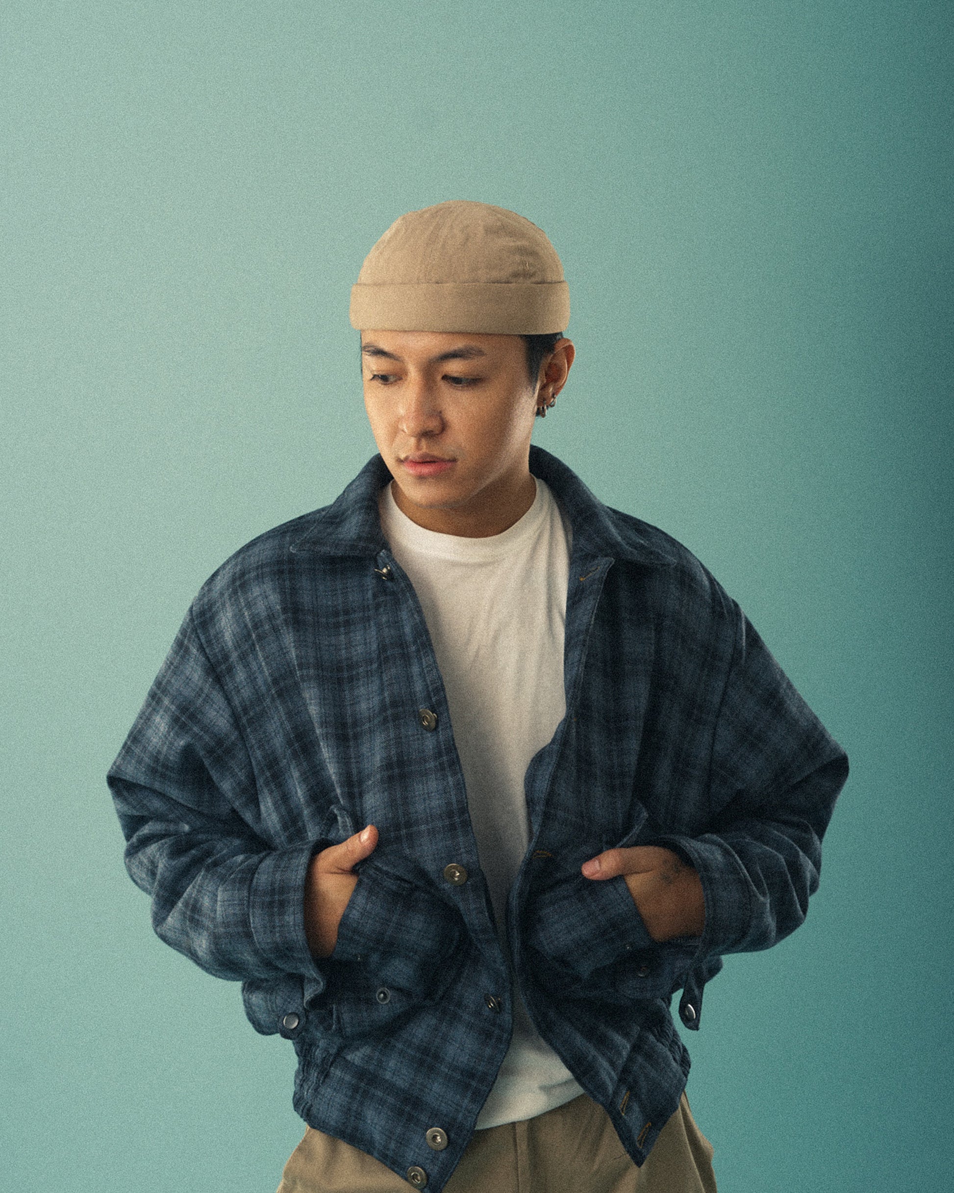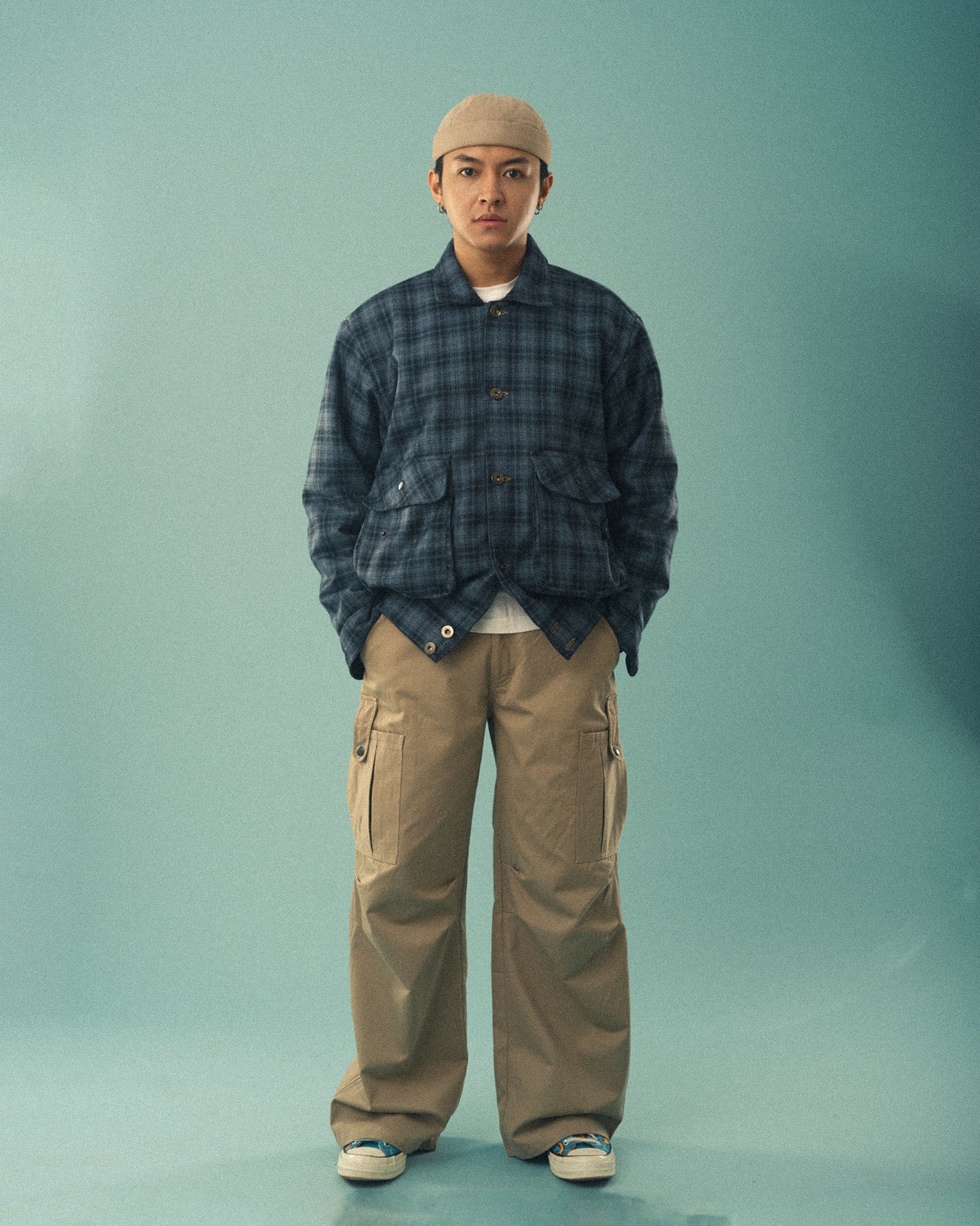 This jacket is adorned with hand-embroidered contrast text on the back, crafted in would blend, button closure, heavy padding, and finished with two cargo pockets.