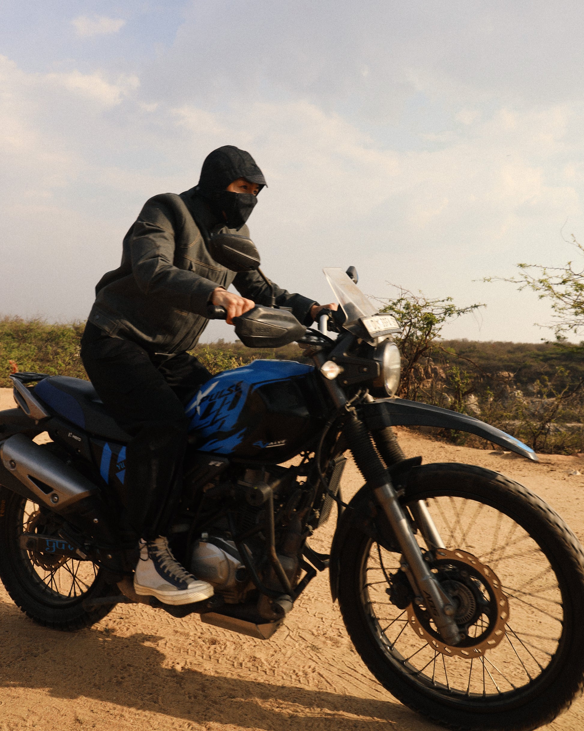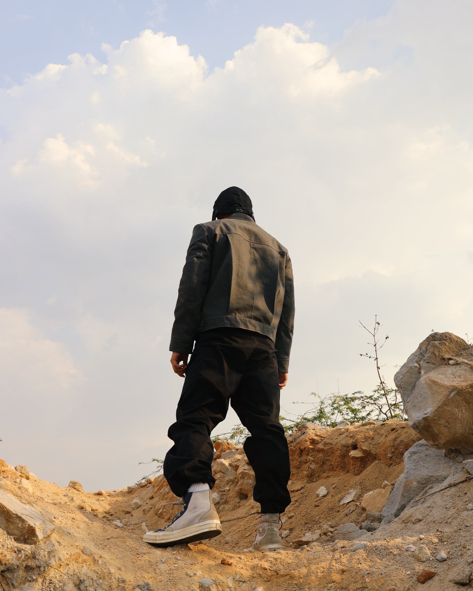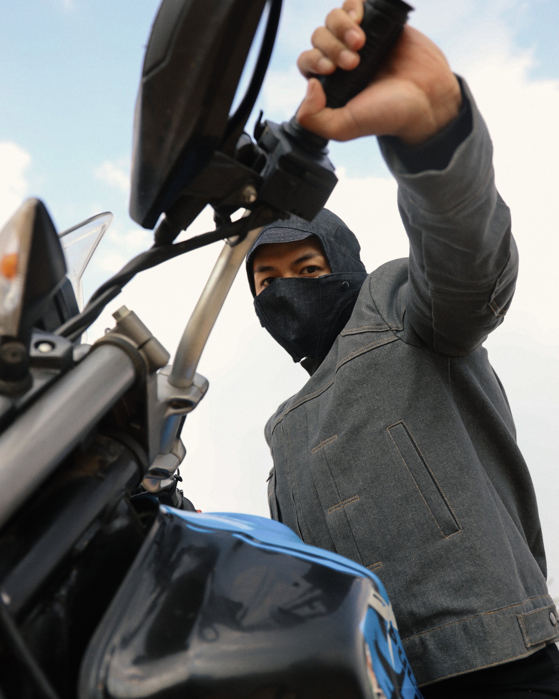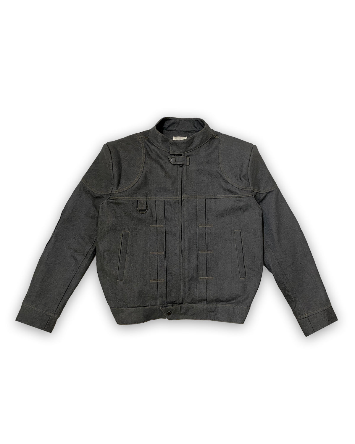 Heavy raw denim jacket with a cropped silhouette. Features padded shoulder panels, front zip closure, and adjustable snap-button tabs at the waist.