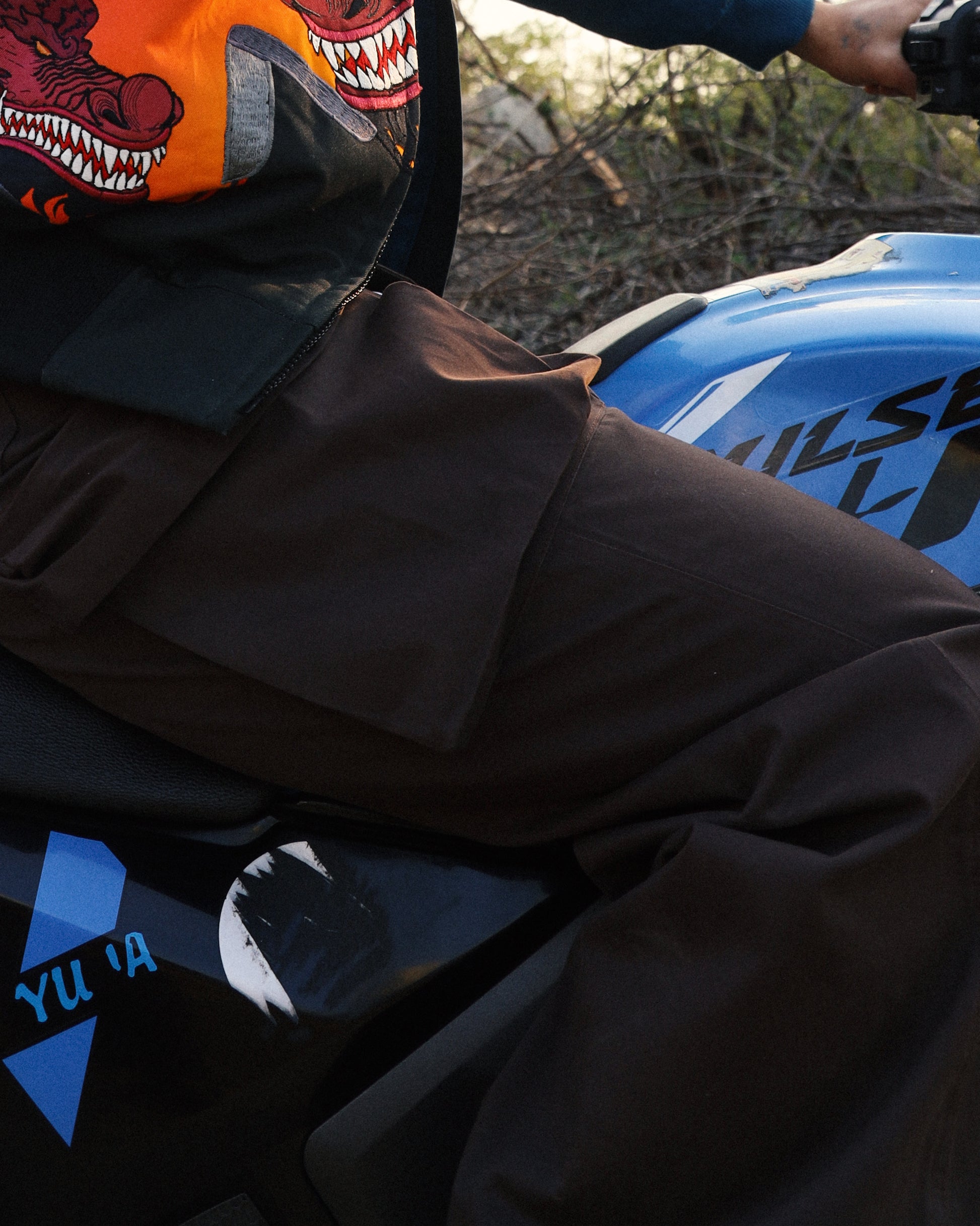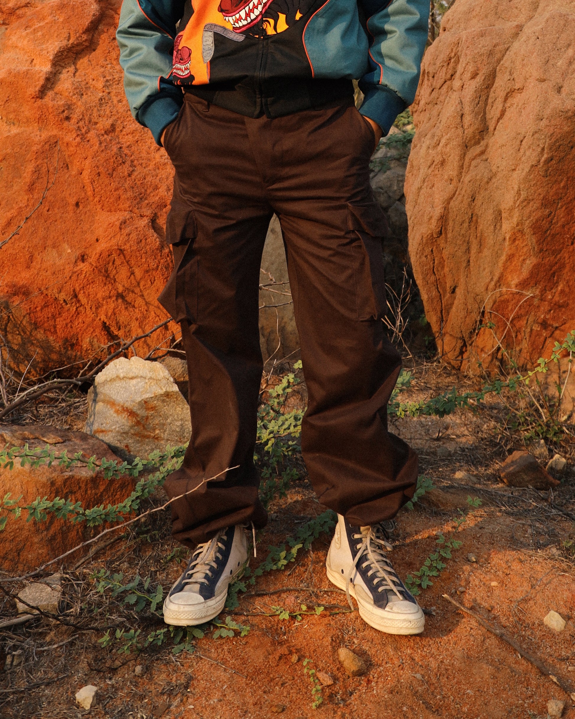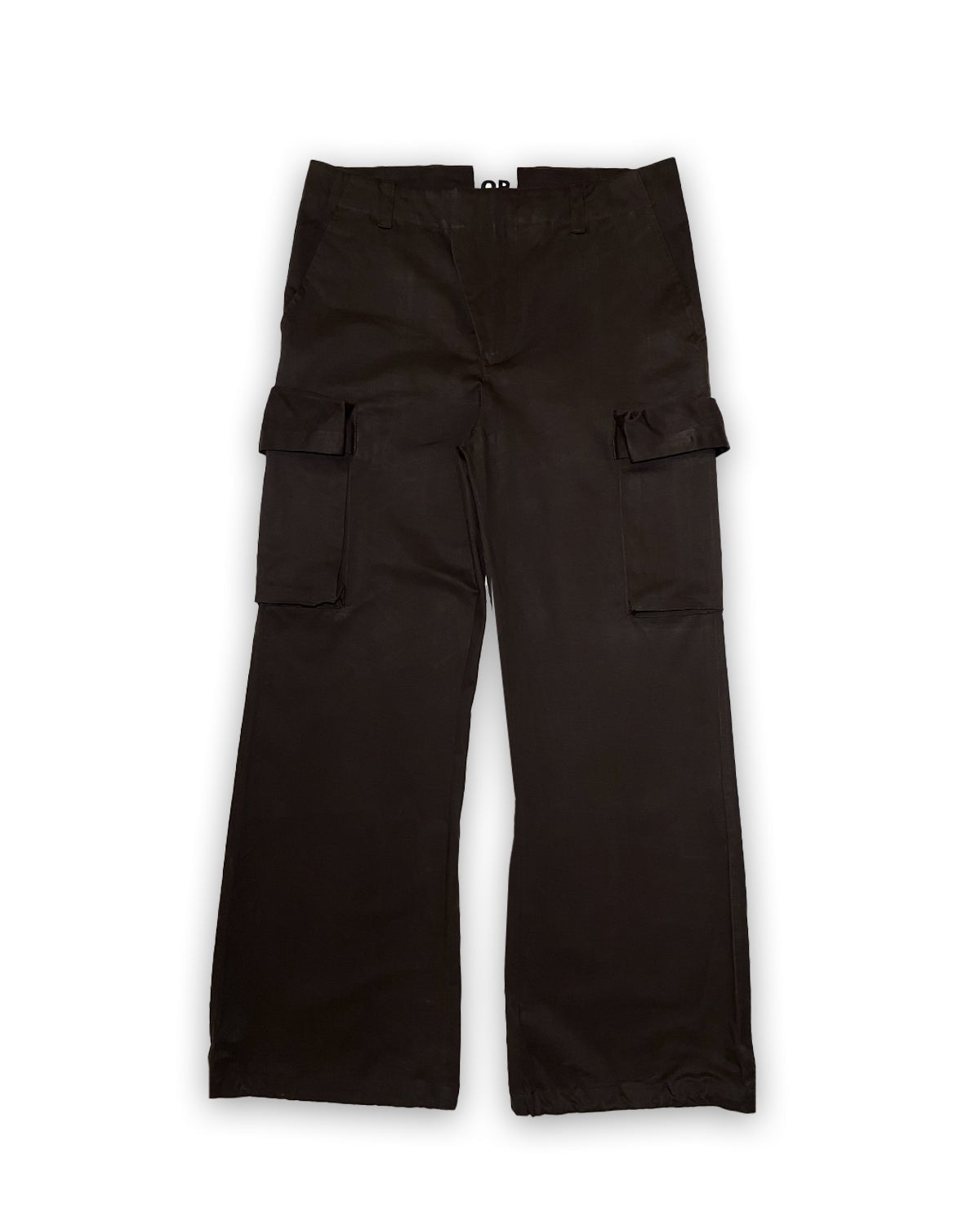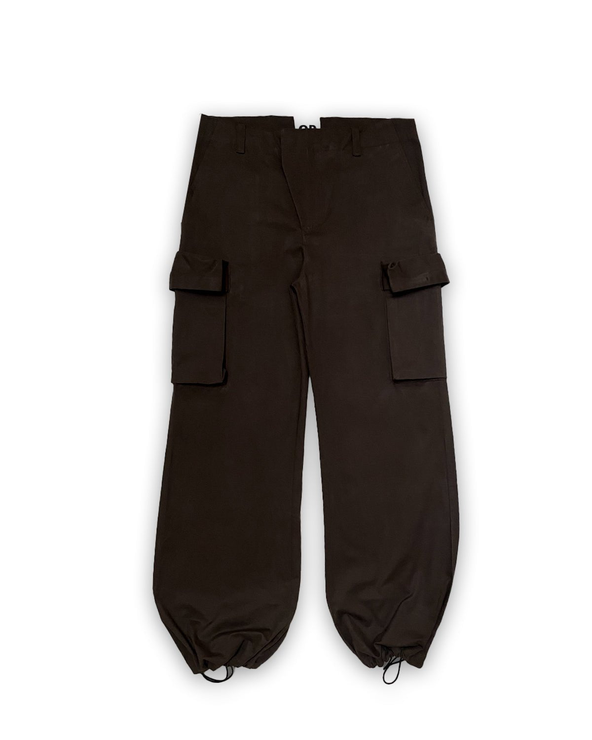 Cotton twill fabric, Features front cargo pockets, adjustable hem fasteners, and a relaxed silhouette.