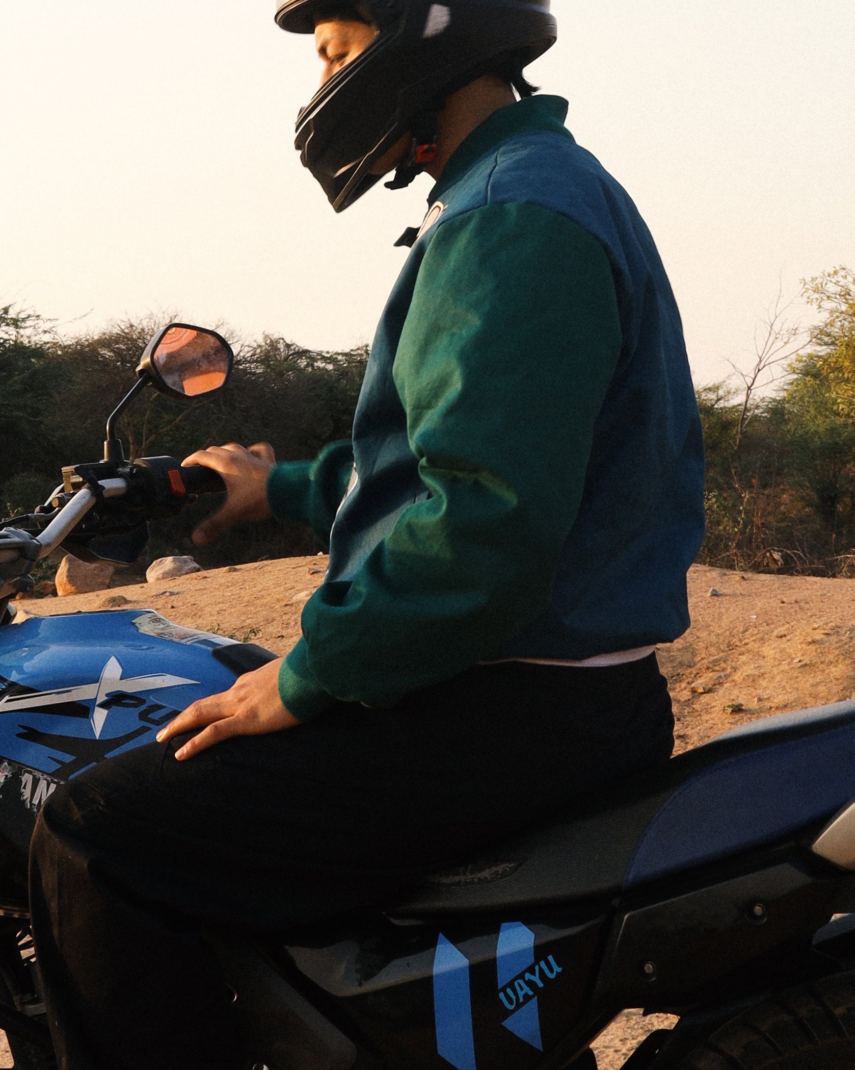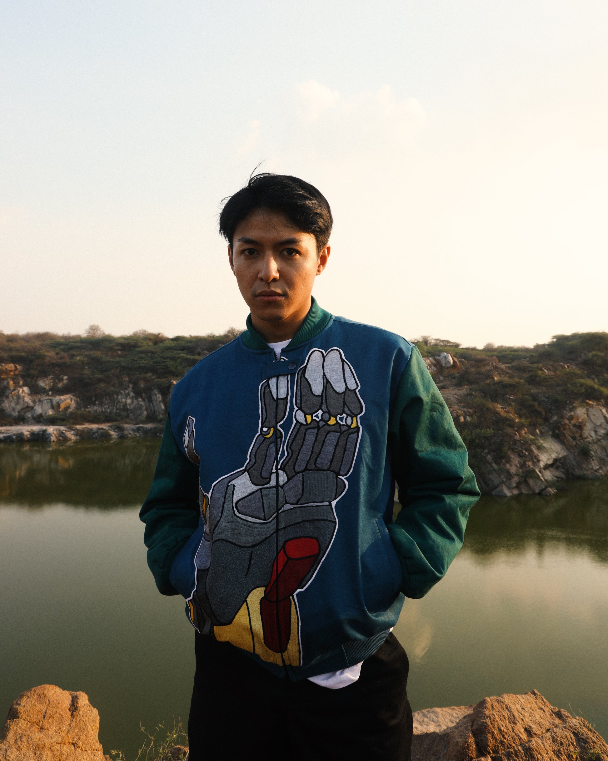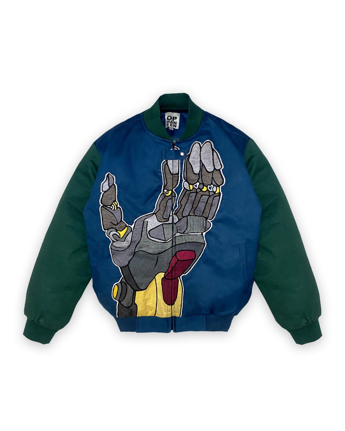 Cotton twill bomber jacket with padded polyester lining. Features hand-embroidered robotic hand detailing at the front, zip closure with a snap button at the collar, and ribbed cuffs and hem.