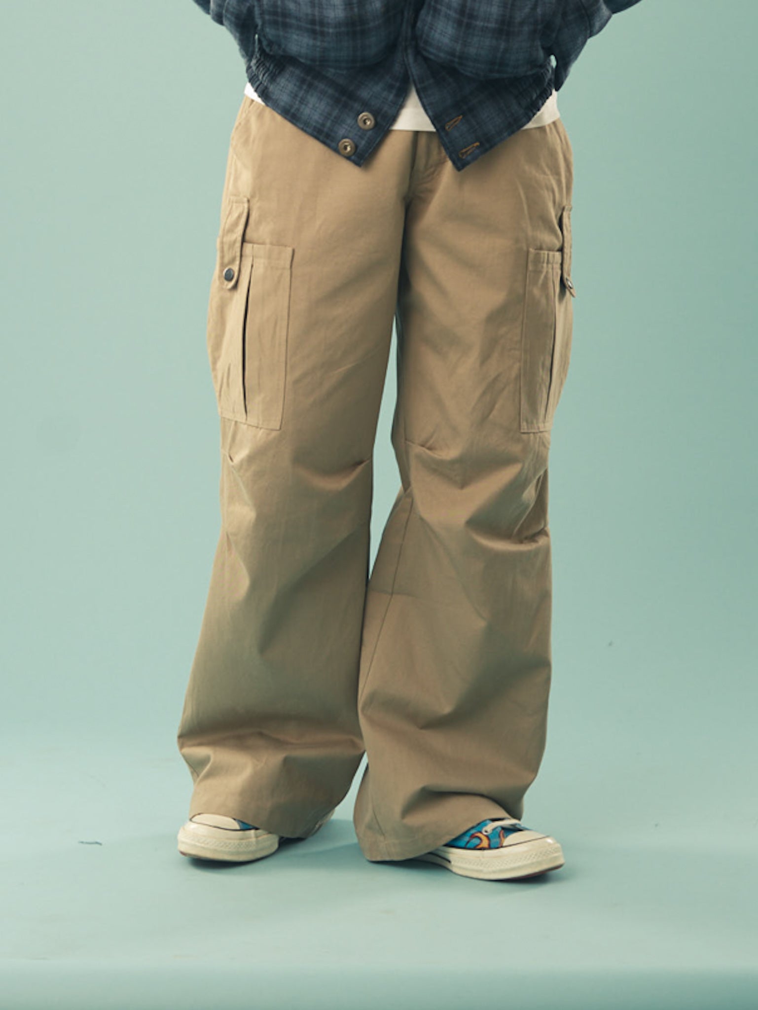 This beige trouser features 100% cotton with snap button cargo pants. Mid-rise, baggy fit, and two-side inset pockets.