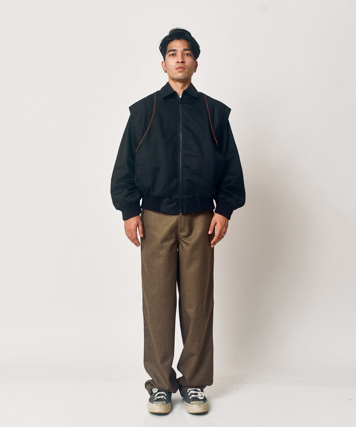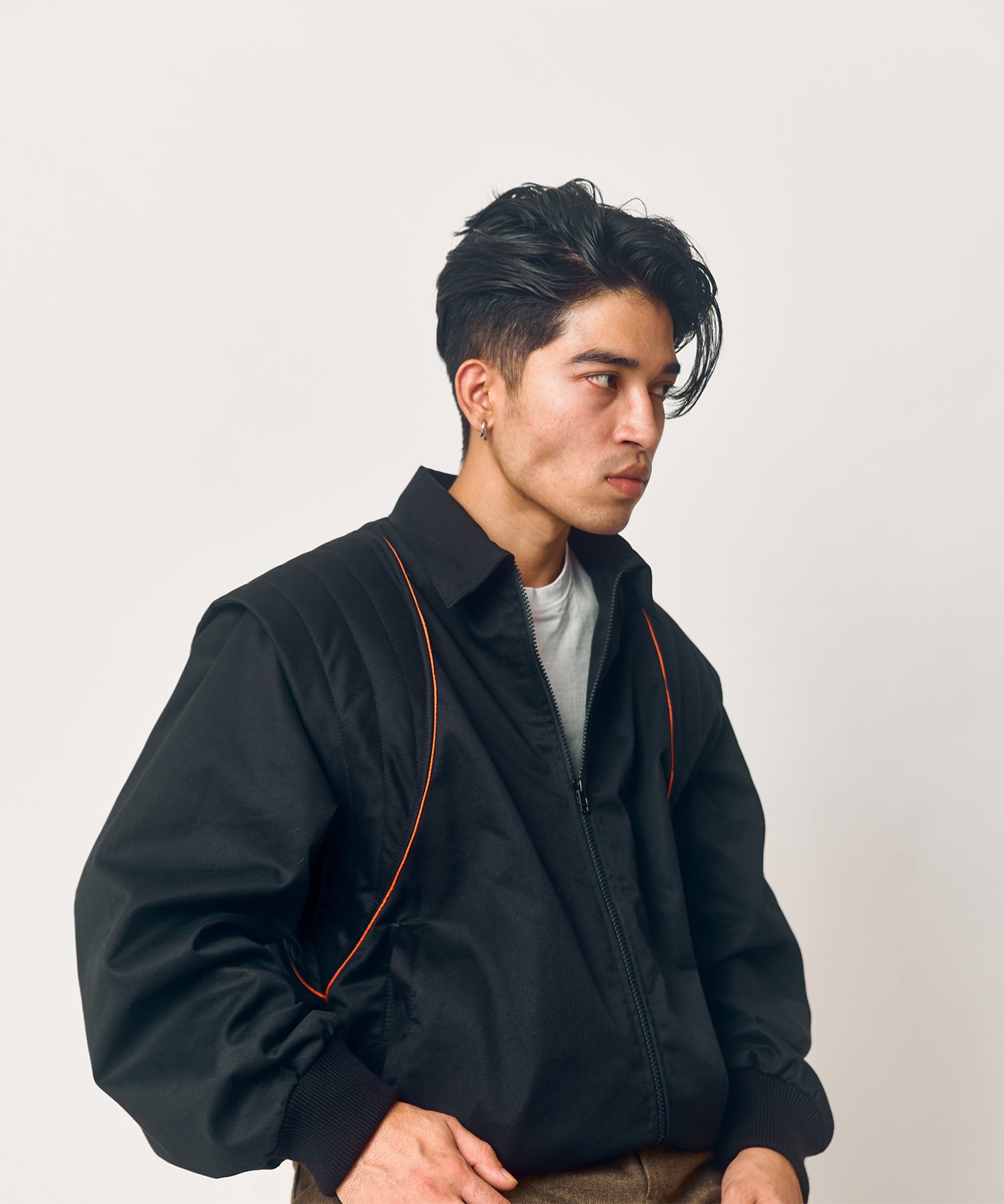 Rider jacket featuring gaberdine fabric, padded shoulder panels, zip fastening, two flap pockets on the front, ribbed cuff, and hem.