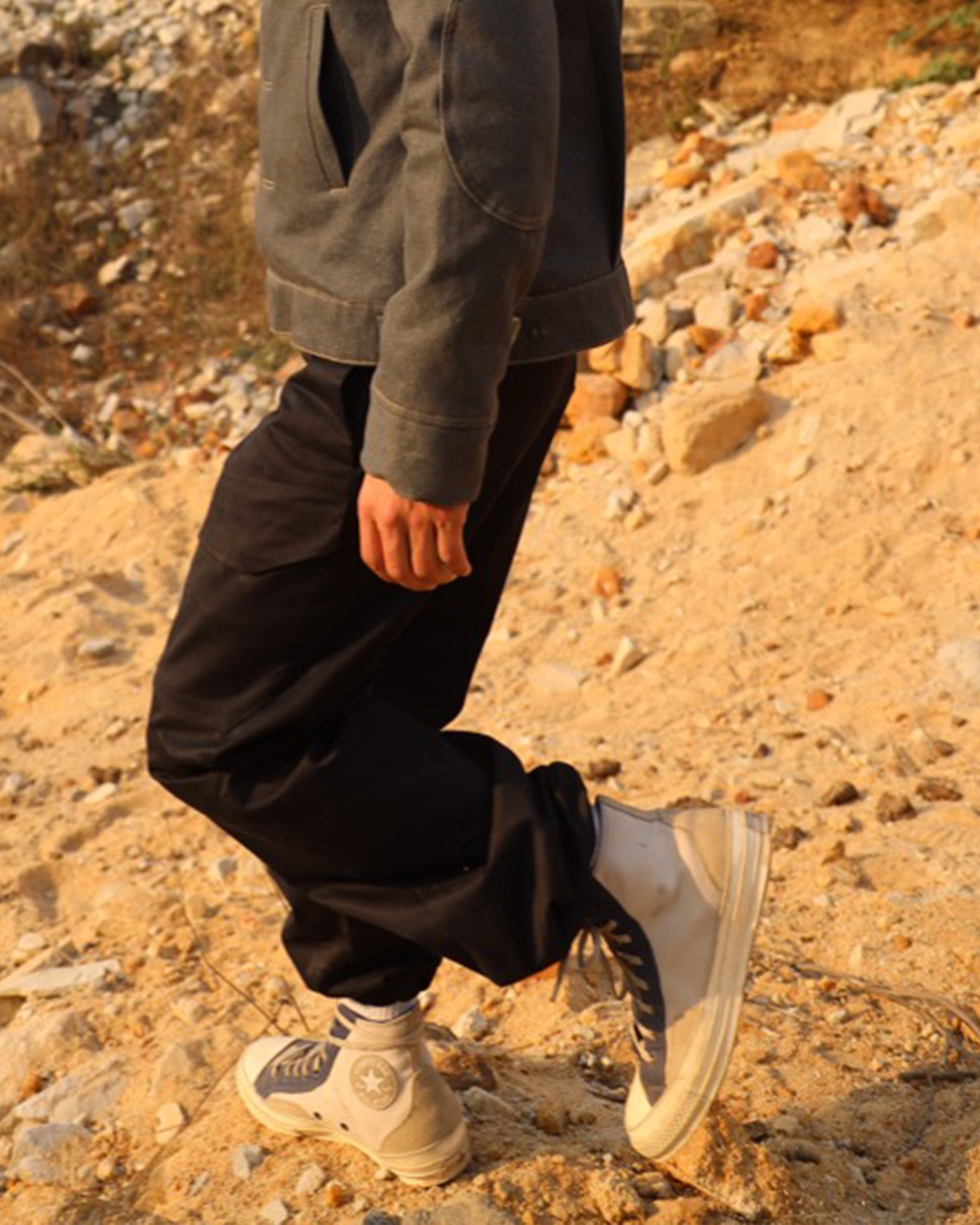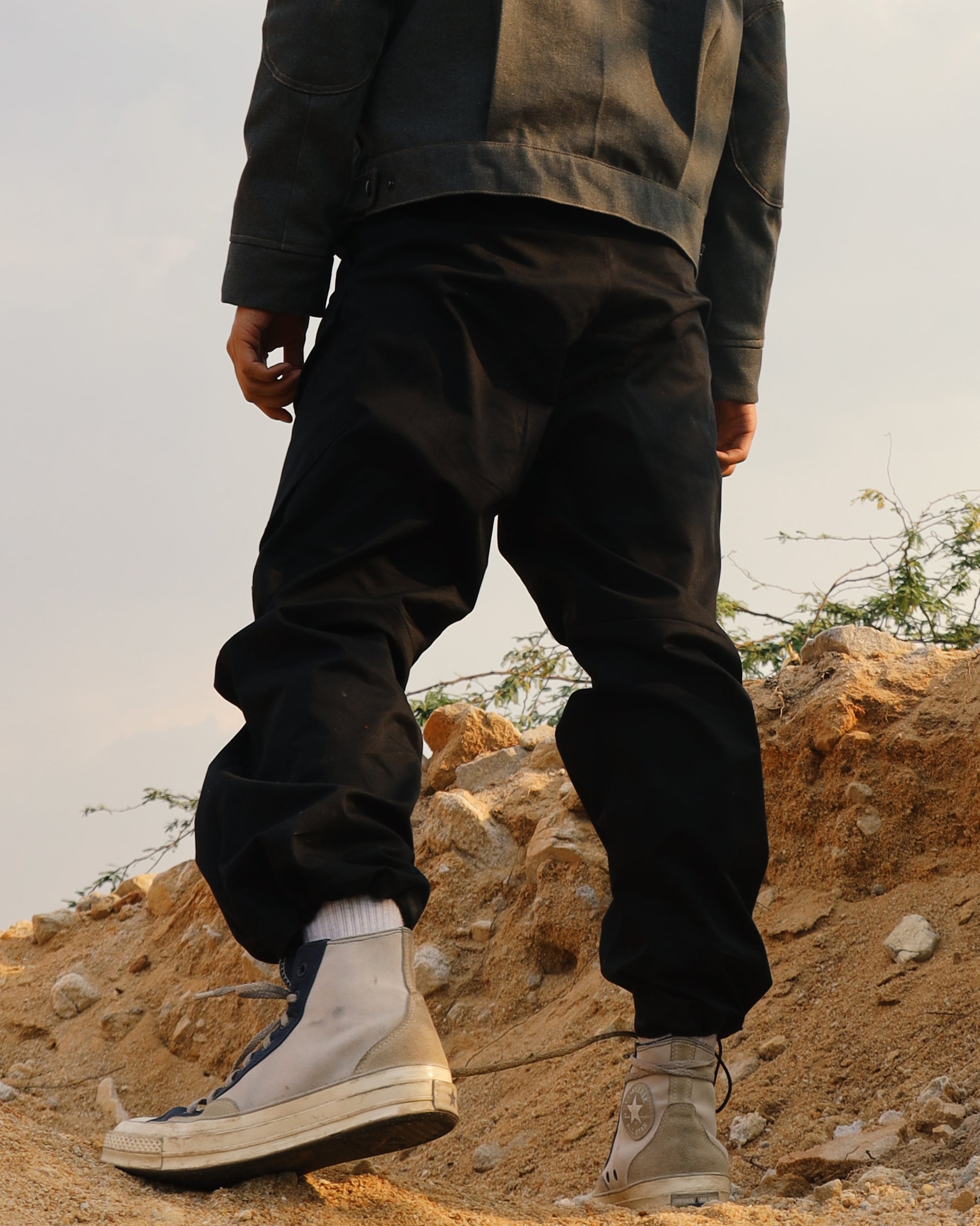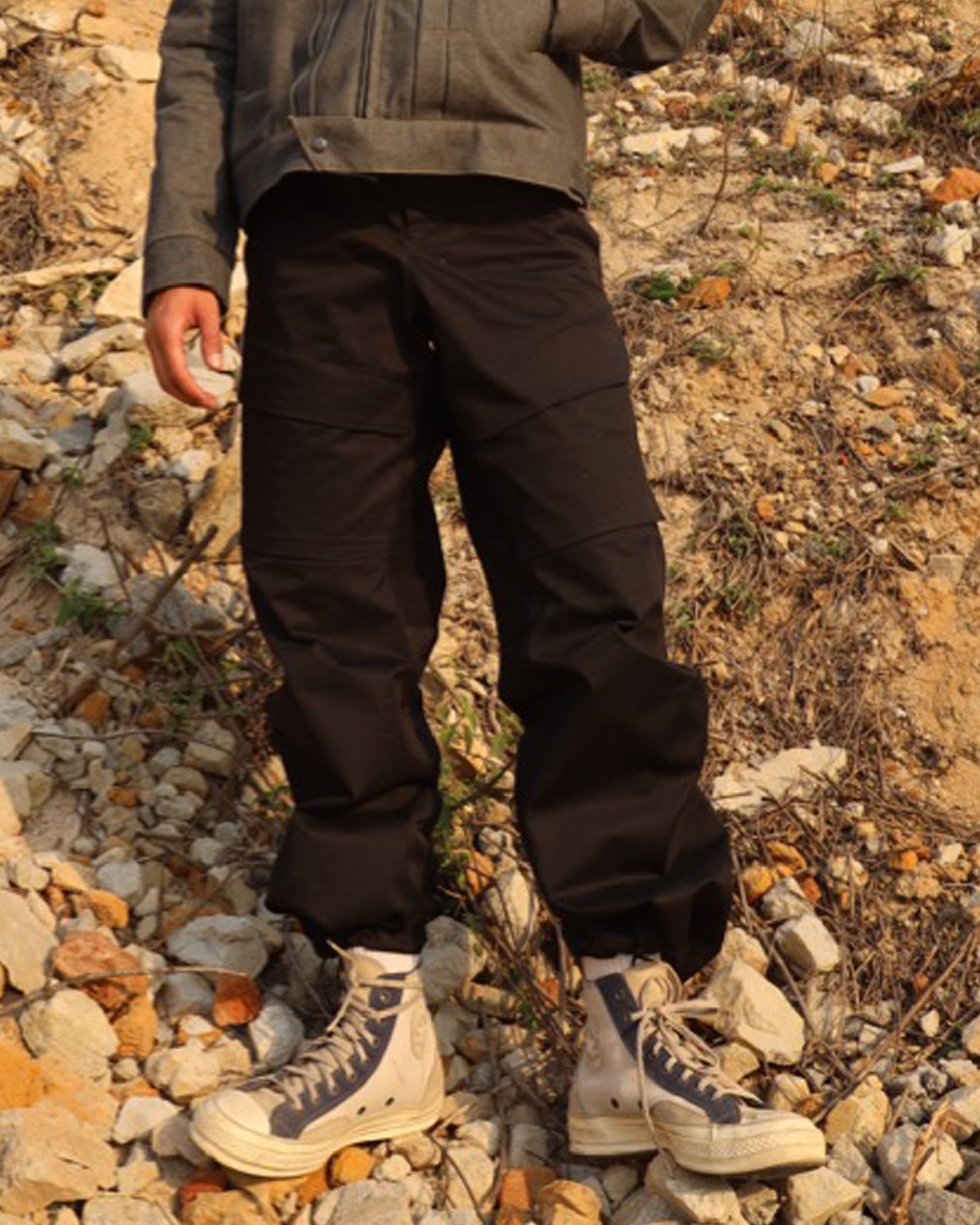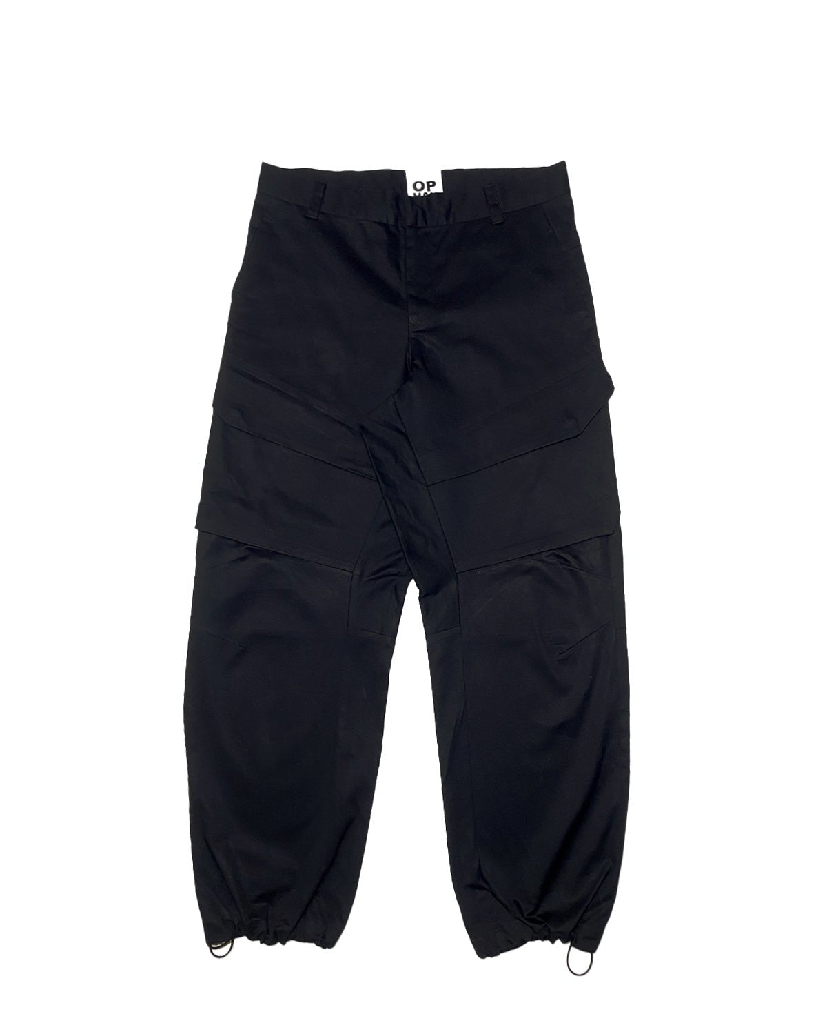 Cotton twill cargo pants with a layered construction. Feature front cargo pockets with snap button closures, adjustable hem fasteners, and a relaxed silhouette.
